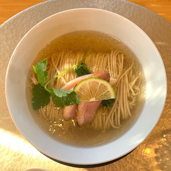 黄金色のスープの中にワンタン、鳥と豚2種類のチャーシュー、めんま、煮卵、三つ葉を乗せた上品な白醤油ラーメン。