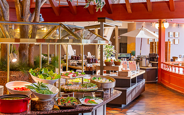 ビュッフェは、明るい雰囲気の中に彩り豊かな料理が並べられていて