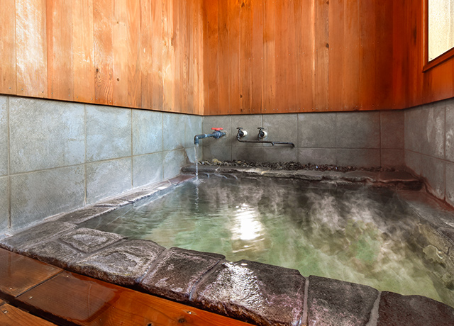 お風呂は、女性、男性それぞれに内湯と露天風呂があり、湯は湯畑源泉です。